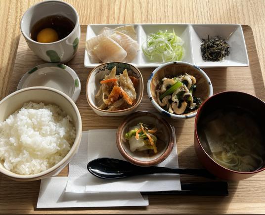 富山駅から路面電車(南富山駅前行)に乗って5分。荒町電停前にあるビルの1階、一汁三菜の美味しいご飯が食べられるお店です。地元の食材をふんだんに使用した定食は、ボリュームも有り、心にも身体にも優しく、地元の方だけでなく観光客の皆様にも喜ばれています。朝食には富山の郷土料理である、昆布〆を薬味と出汁卵をご飯にかけて食べる「こぶじめし」の定食(1,300円)や、富山の漁港で捕れた魚を使って作った昆布〆定食(1,600円)、ホッケやカレイなど地物の干物焼き定食(1,600円)などを提供しています。