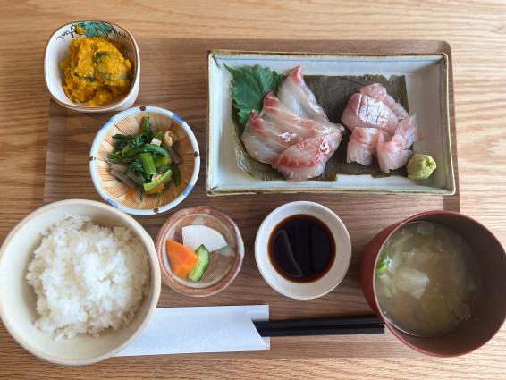 ランチには地物の魚フライ定食や週替わり定食などがあり、毎日手作りの小鉢も人気です。