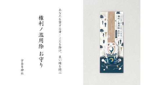 肌身離さず携帯することで、良い人・環境・縁に恵まれるよう宇奈月神社にて祈祷しています。苦しい境遇におかれた時、新しい生活を始める時、お友達がパワハラやセクハラなどに悩まされている時、これから社会へ出るお子様への贈り物を探している時には、ぜひ「権利ノ濫用除お守り」をお迎えください。