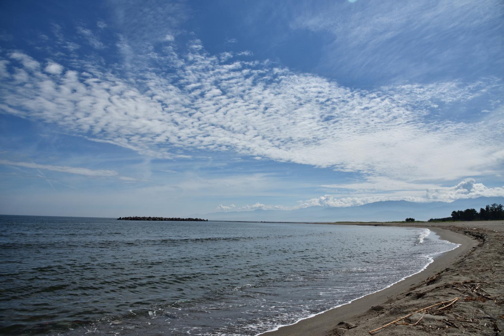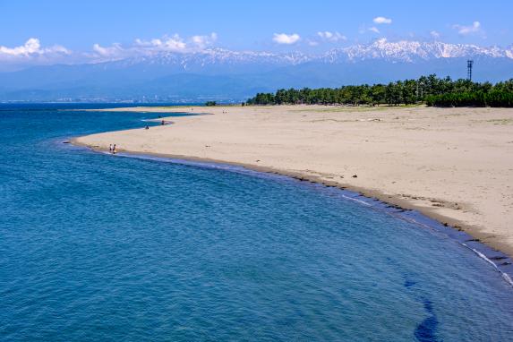 海と山、ふたつの眺望が一緒に楽しめるとっておきのスポットです。海水浴を楽しみながら、立山連峰のアルプスの素晴らしい景観、白砂青松100選に選ばれた美しい「古志の松原」も間近で堪能することができる海水浴場です。