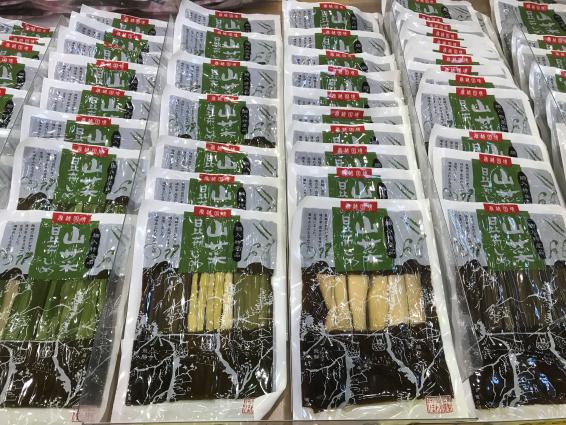 店頭では、細入地区特産の「らっきょう漬け」や「山菜昆布〆」、「とちの実のはちみつ」をはじめとした富山の特産品、「飛騨牛」を使ったお土産など飛騨の特産品を販売しております。