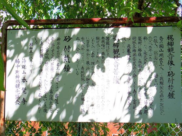 丘の夢牧場の麓にある本覚寺は、16世紀半ばに越中最大の勢力を誇っていた神保長職の菩提寺と伝えられ、それを記す多くの古文書が保存されています。この寺の梵鐘は、砂付き梵鐘と呼ばれ、市有形文化財に指定されています。鐘の音が富山城のものより素晴らしかったことで佐々成政の怒りに触れ、内側に砂を焼き付けさせられたとの逸話が残っています。また、安置されている銅像・楊柳観音像は、国の重要美術品に認定されています。