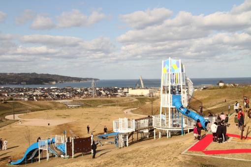 朝日山公園「見晴らしの丘」に設置された大型遊具では、長さ23メートルのローラー滑り台などで30種類以上の遊びが楽しめます。高さ6メートルを超えるシンボルタワーからの景色も見ものです。ほかにも約1万平方メートルの芝生広場やさまざまな活動に利用できる休憩施設のセンターハウスなどを整備し、子供から大人までが氷見の自然や景観を感じながら伸び伸びと過ごせる、緑あふれる憩いの場となりました。