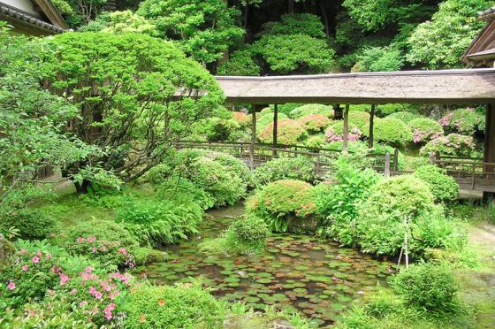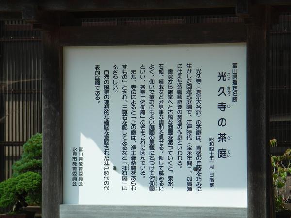 光久寺の茶庭は、開創約1,200年の光久寺の境内にある茶庭です。江戸時代の加賀藩御用造園師・駒造の作庭とされ、城端・善徳寺の庭とは兄弟庭と伝えられています。丘陵を巧みに生かした山水造りとなっており、泉水には中島も浮かび、さりげなく配された石組みと植栽の妙趣や背後の樹木との見事な調和が「俯して見る池もよし、仰いで見る山もよし」といわれ、別名「俯仰園」とも呼ばれています。四季それぞれに美しい茶庭ですが、ツツジの頃が一段と美しくおすすめです。