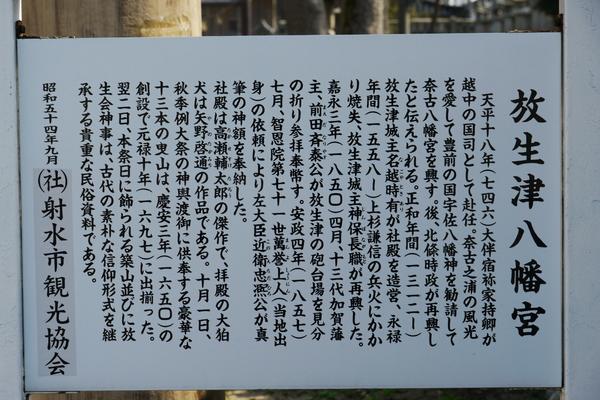 放生津八幡宮は、大伴宿祢家持が越中の国司として赴任した際、奈古之浦の風光明媚な景色を愛でられ、豊前の国(現在の北九州から大分北部)から宇佐八幡神を勧請して、奈呉八幡宮と称されたのが創始であると言われています。祭神は「応神天皇」で、「仁徳天皇」が配祀されています。また、境内には大伴家持歌碑「あゆの風いたく吹くらし奈呉の海人の釣りする小舟こぎ隠るみゆ」と芭蕉句碑「早稲の香や分け入る右は有磯海」が建っています。また、令和3年3月11日には、放生津八幡宮祭の曳山・築山行事(10月1日-2日開催)が国重要無形民俗文化財に指定されました。ぜひ、参拝に訪れてみてください。