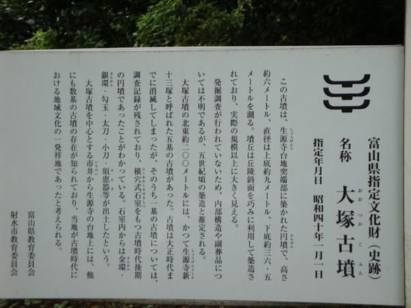 大塚古墳は、1965年富山県指定史跡に指定されました。発掘調査は行われていないため、内部構造や副葬品などの詳細は不明ですが、5世紀頃に築かれたと推定されています。きれいな形を保った、径約35m、高さ約6mの円墳です。大正時代までに消滅してしまいましたが、明治時代には、近くに5基の古墳があったとされ、当時この地域にかなり大きな勢力が存在していたと思われます。どんな大きな勢力があったのか、この地を訪れてかつての様子を想像してみたくはありませんか。