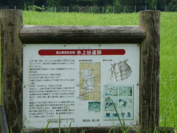 水上谷遺跡は、1972・1973年の調査で縄文時代中期の集落跡と確認さ住居跡16棟も見つかっています。中には、一つの住居跡に2個の石組炉をもつ比較的大型のものがありました。土器には、深鉢や浅鉢などが認められ、石器には磨製石斧、石錘、石皿が多く、打製石斧や石鏃の少ないことが注目されました。1975年には、県指定史跡に指定され、射水丘陵の狭い谷平野につくられた集落にもかかわらず、その規模の大きさが注目されている貴重な遺跡です。ぜひ訪れてみてはいかがでしょうか。