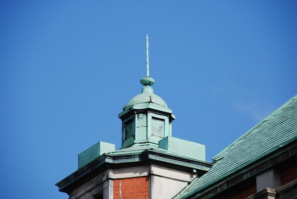 通り沿いの北棟は大正3年に建設された鉄骨レンガ造りの2階建てで、左右に塔をデザインし、外壁には赤いレンガに白い石で装飾しており、土蔵造りの町並みの中でひと際目をひく建物となっています。