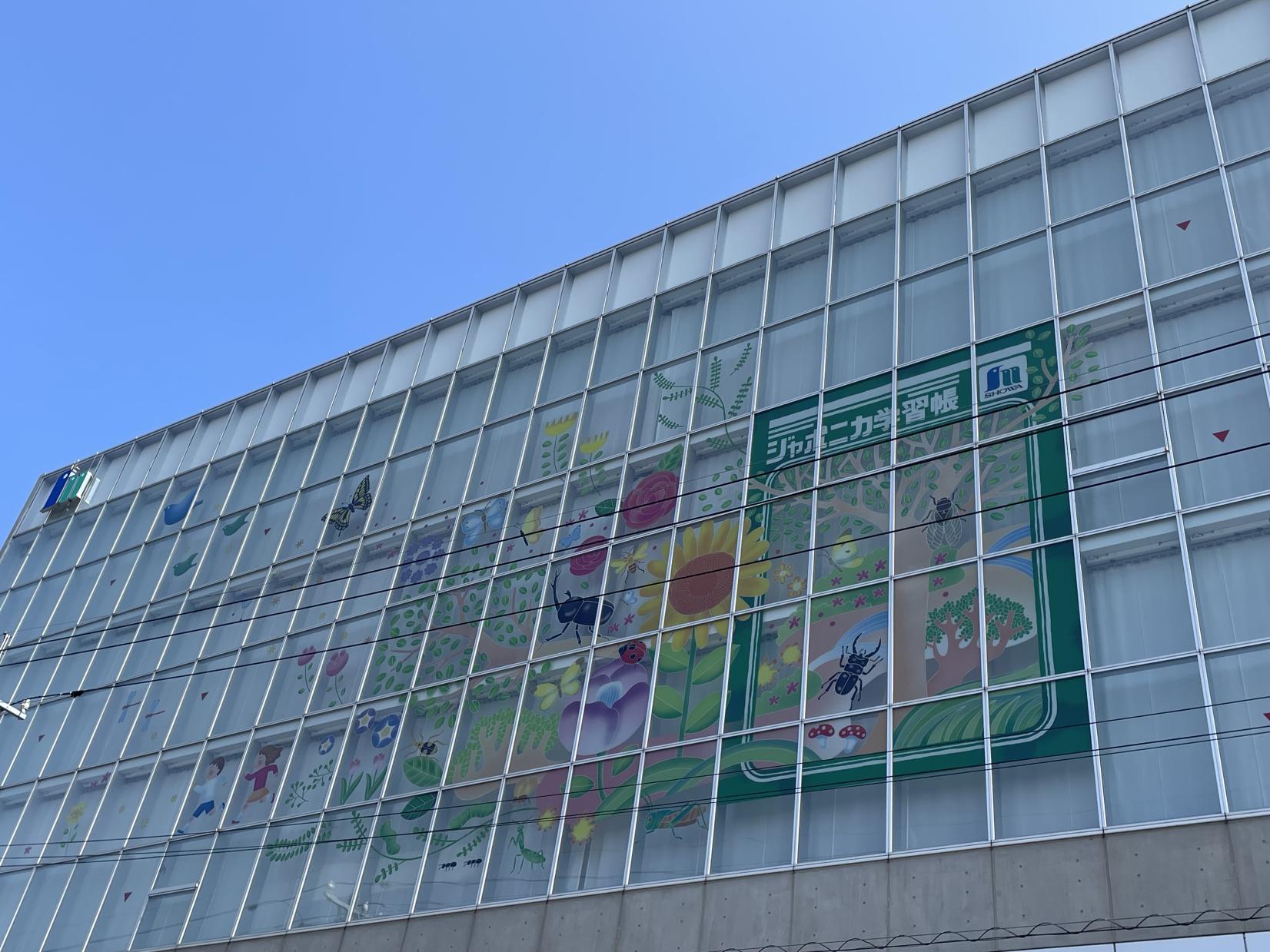 工場の壁面にはドラえもん学習帳(おとぎの森公園側)とジャポニカ学習帳(国道156号側)が描かれていて、天気の良い日には絶好のフォトスポットにも!
