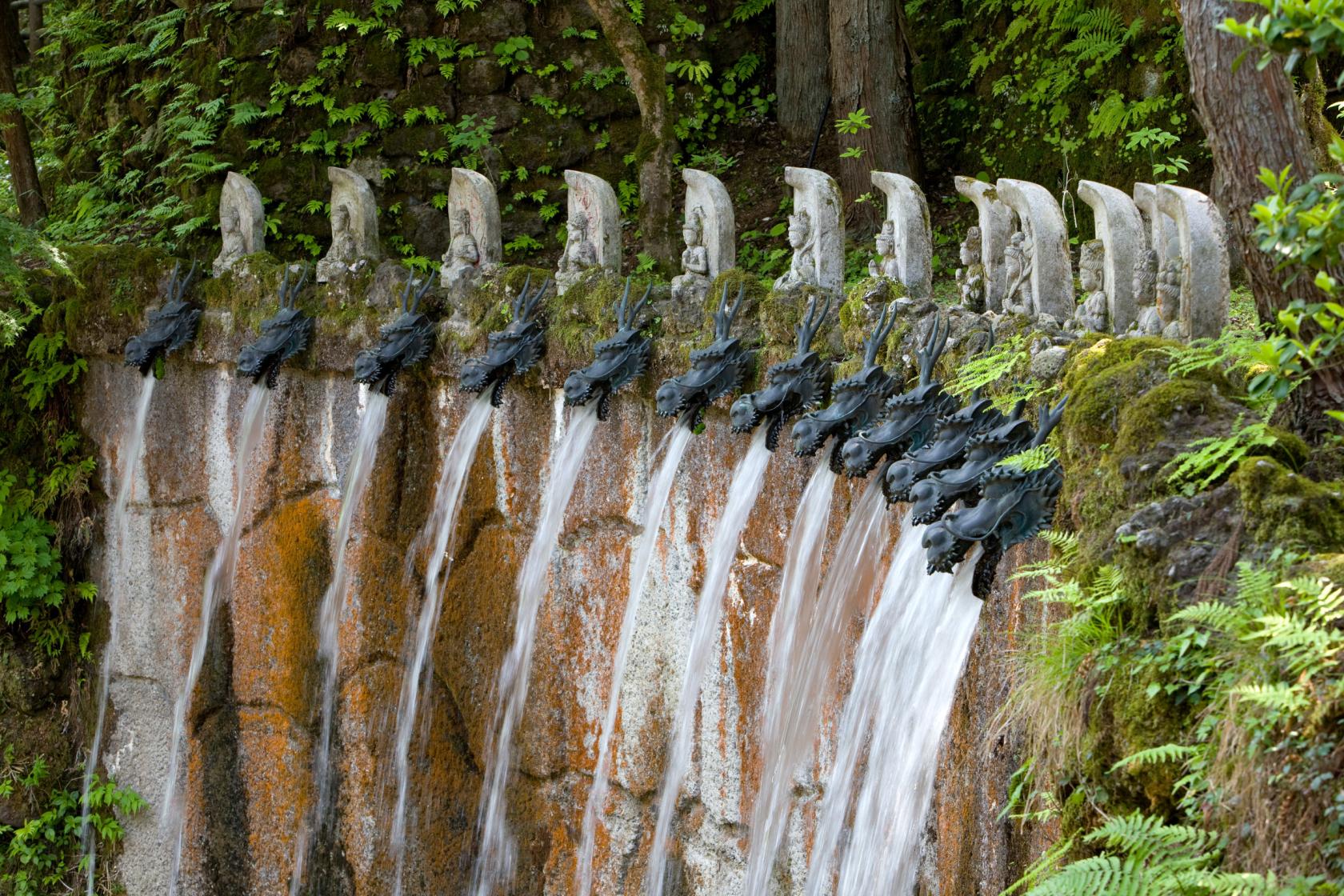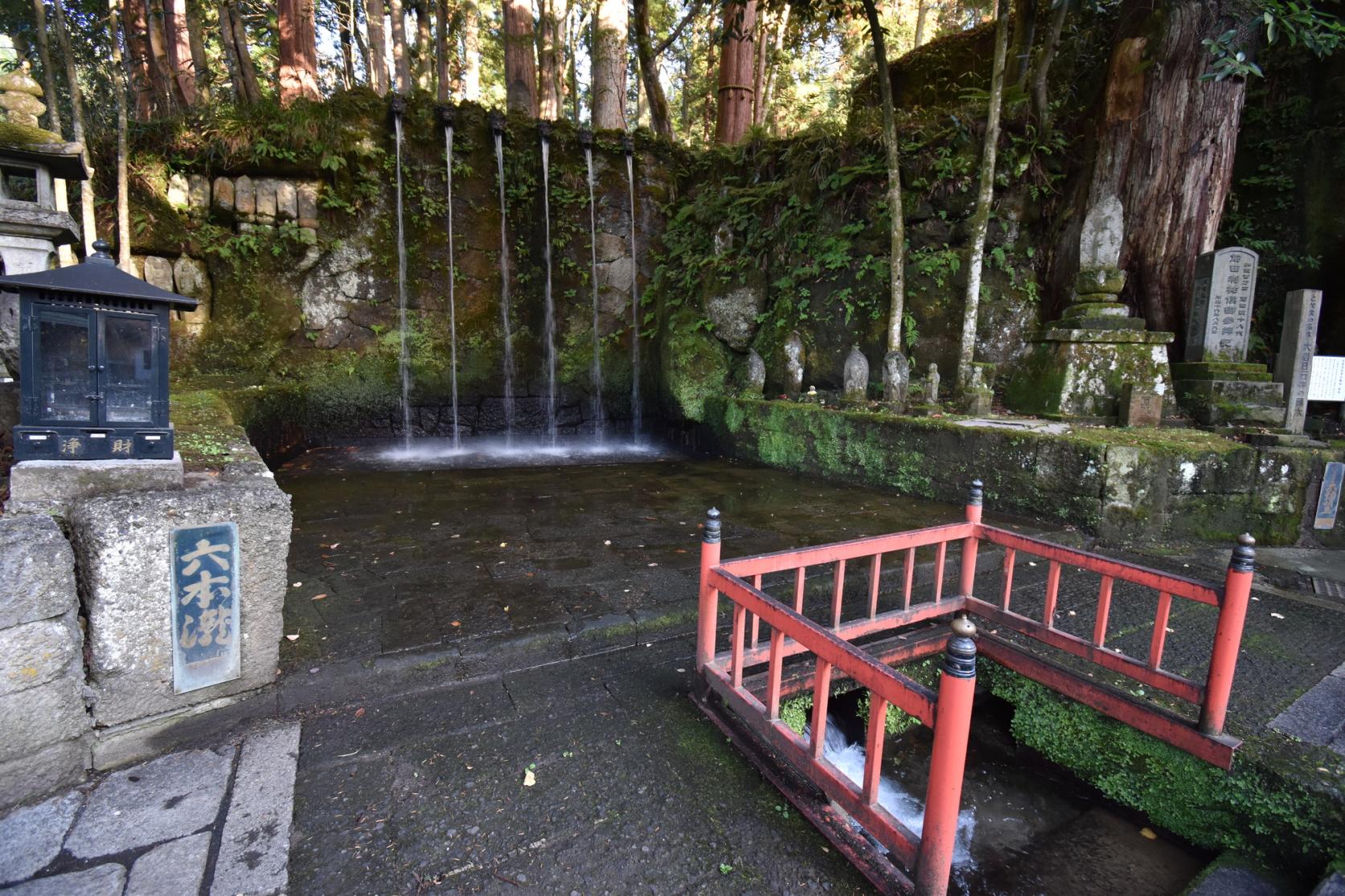 六本滝での滝行は、白装束に身を包み、六大(地、水、火、風、空、識)をあらわす6つの竜頭から落ちる滝に打たれ、六欲煩悩を洗い落とし心身を清めるものです。