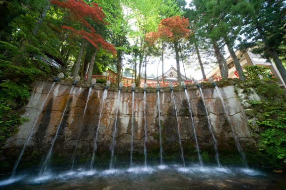 百段坂と言われる石段の参道沿いは、門前街と呼ばれ、お食事処や旅館が建ち並び、そうめんやところ天、川魚や山菜など、美味しい料理を満喫できます。中でも「そうめんと言えば大岩」と言われるほど、富山の美味しいお水で調理されたそうめんは、その美味しさと美しさで有名です。
