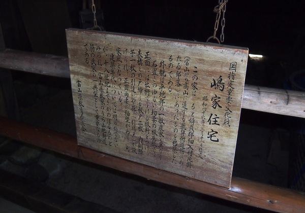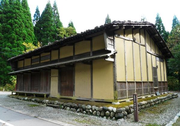 映画『劔岳 点の記』のロケにも使用された旧嶋家住宅は、富山県の山地街道筋の民家の典型例として、国指定重要文化財に指定された家屋です。かつては飛騨街道、猪谷関所近くの細入村片掛にあった住宅を1971年に現在地に解体移設修理しました。黄土色の土壁は、往時の姿を感じさせます。屋根は切妻造、勾配は飛騨の影響を受けてかなり緩やかで、板葺きの石置屋根です。また出入口の板戸二枚に障子が設けてあるなど、町屋風の特色を示しており街道筋にふさわしい建て方となっています。建築年代は不明ですが、形式や手法から18世紀までさかのぼると推定されており、昔ながらの生活を垣間見ることができます。