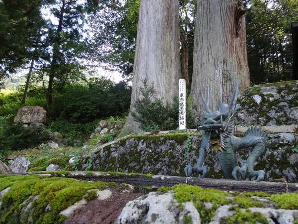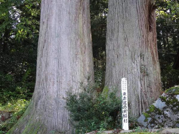 東赤尾の八幡社北側にそびえるこの夫婦杉は、樹高35m、樹冠の広がりは約17mで、直径は両方とも約5.1mと、見事な姿でたたずんでいます。樹勢も良く、いつまでも夫婦より添い、人々を見守ってくれることでしょう。