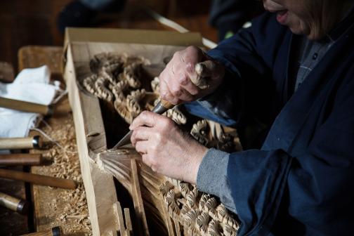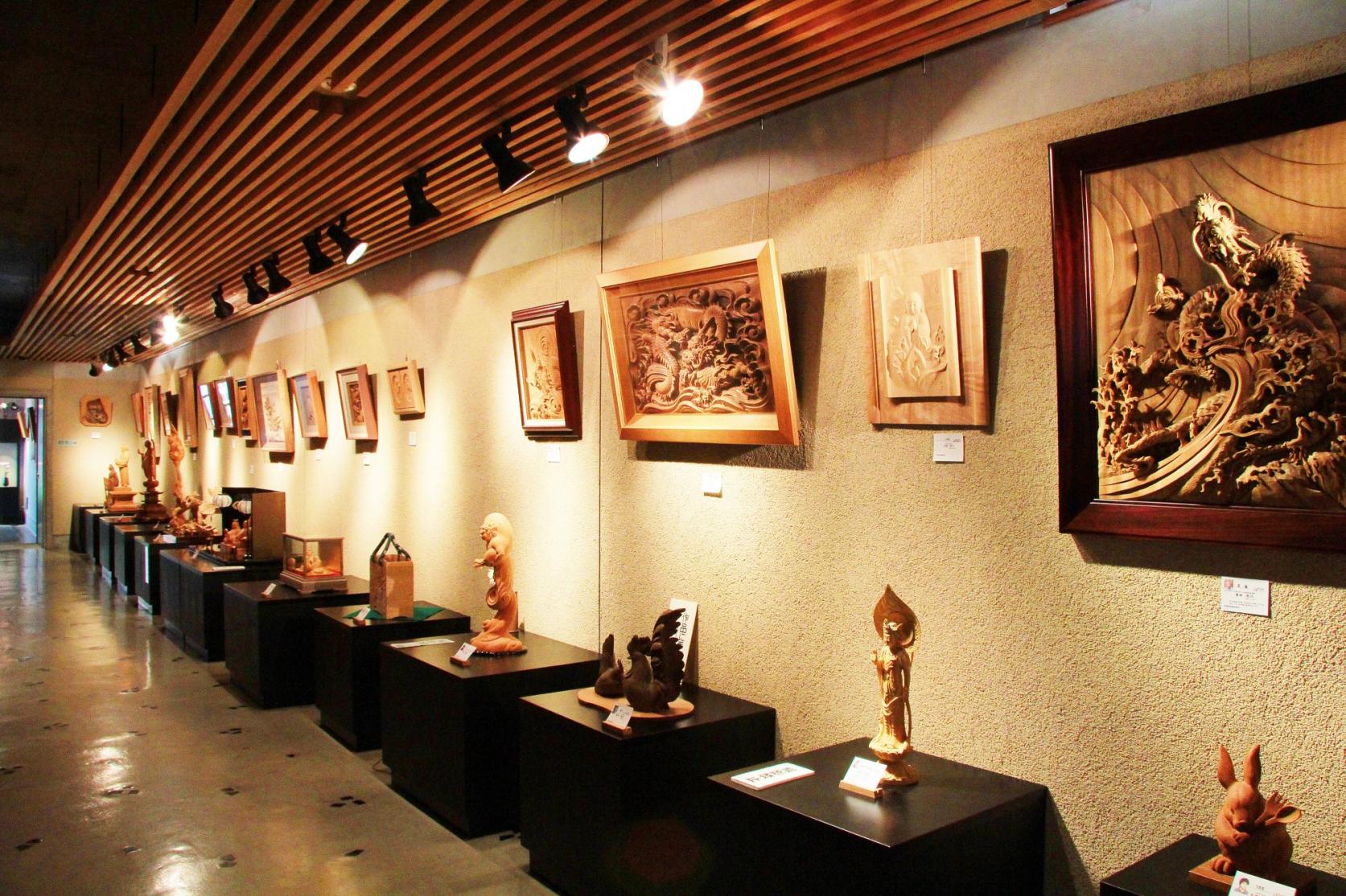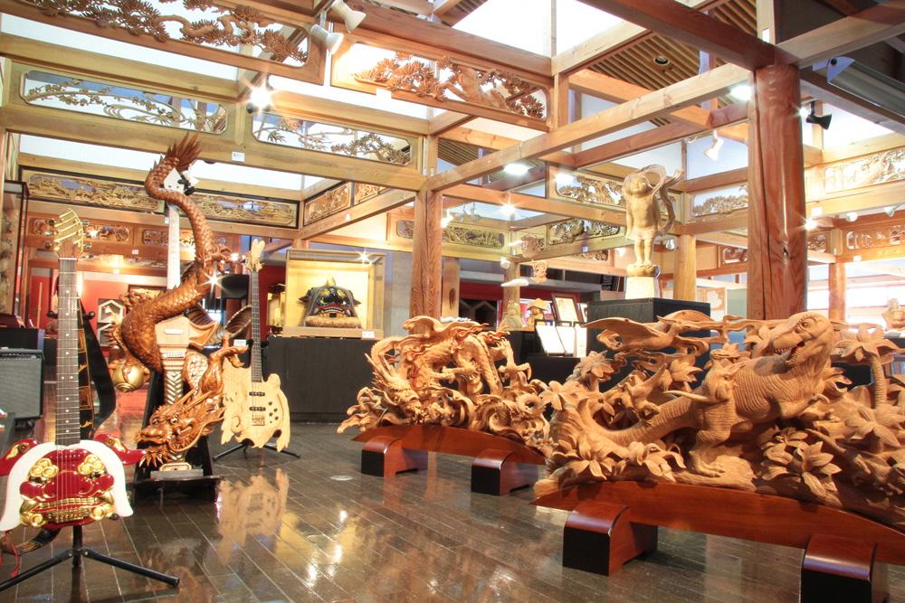 井波彫刻総合会館は、イギリスの建築家ピーター・ソルター氏のデザイン設計で、建物の内外共、芸術作品になっております。館内には豪華絢爛な欄間・衝立・獅子頭・天神様をはじめ、抽象オブジェ・エレキギター等の井波彫刻の作品が200点以上展示されており、国指定伝統的工芸品の粋を堪能できます。そして密かな人気の彫刻カプセル自動販売機「獅子ガチャラ」や館内の至る所に隠れている「シークレット彫刻」等、大人も子どもも楽しめる木彫アミューズメント施設となっております。