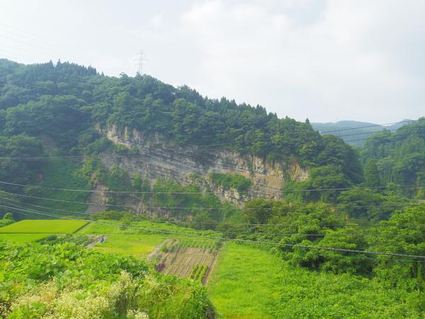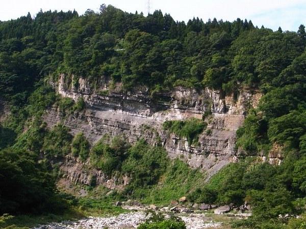 なかなか見られない、美しく重なり合った地層。庄川の鎧壁は、板を積み重ねたような地層の重なりで、あたかも鎧のクサズリのように見えることから名付けられたとされています。この地層は新第三世紀に属し、凝灰質砂岩と泥岩が互層し南方へ傾斜しています。露出地層の左端最大高さ約72m、下部の最大幅は234mとなっており、見事な景観を見せていて、訪れる人を驚かせています。
