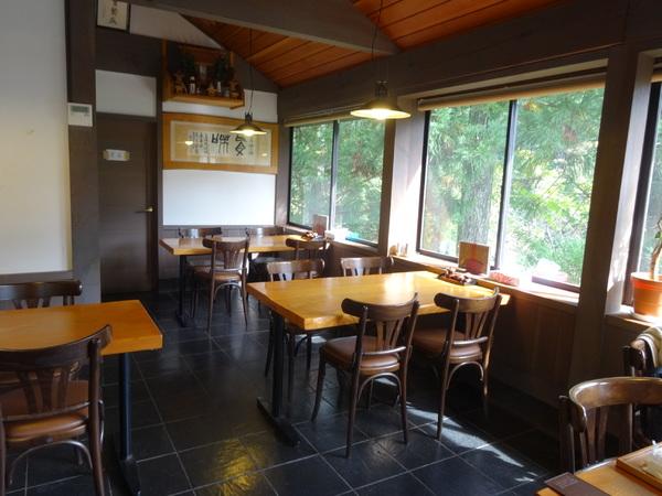 店内奧のテーブル席からは、ガラス越しに庄川の清流を見下ろすことができ、自然の中での食事を楽しめます。