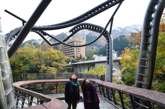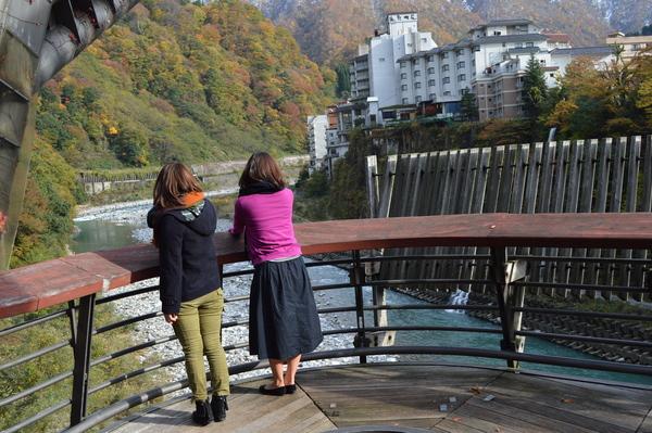宇奈月温泉街のなかにある展望台です。周囲を流れる黒部川を一望できます。この斬新で不思議なスタイルはスペインの建築家、エンリック・ミラーレスが設計したもので大空に鳥が飛び立つ雄姿を造形したそうです。眼下に黒部川の清流を感じながら温泉街やスキー場、大原山の観音像が眺望でき、温泉街散策にもちょっとしたハイキングにもぴったりの人気スポットです。