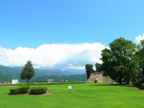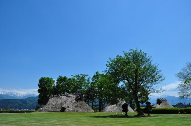 縄文時代の生活を学ぶことができる遺跡公園です。朝日町不動堂地内の旧扇状地の末端に位置し、発掘調査から縄文時代中期の食糧貯蔵や加工用の深い穴、多量の土器や石器、21棟の竪穴式住居が掘り出され注目を集めました。特に住居跡は東西17m、南北8mの日本最大級のもので集落の集会所のような公共性の建物として考えられています。このことから縄文時代の集落構造や社会生活を探る上で貴重な遺跡として、国の指定史跡登録を受けました。また、タイプの異なる3棟の住居跡を原寸大に復元して、縄文時代の生活を感じることができる公園として整備され、隣接する歴史公園や七重滝と合わせて楽しみながら学べる観光スポットとして人気です。