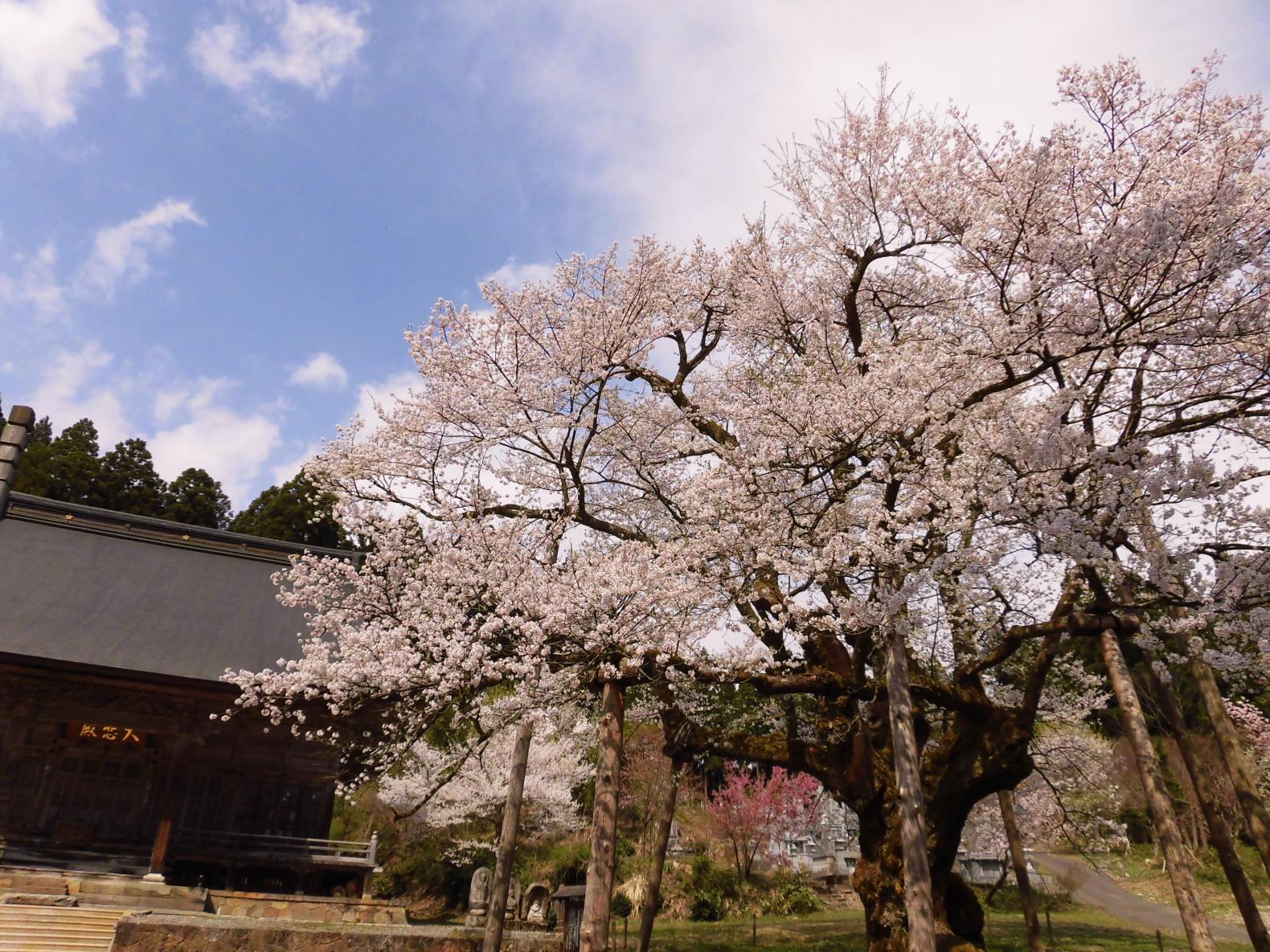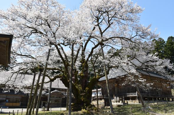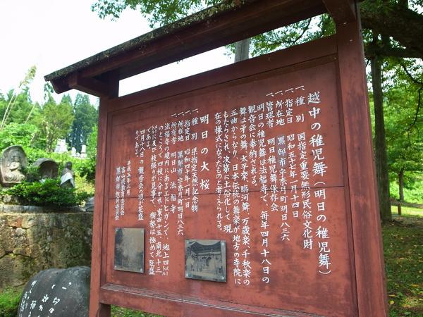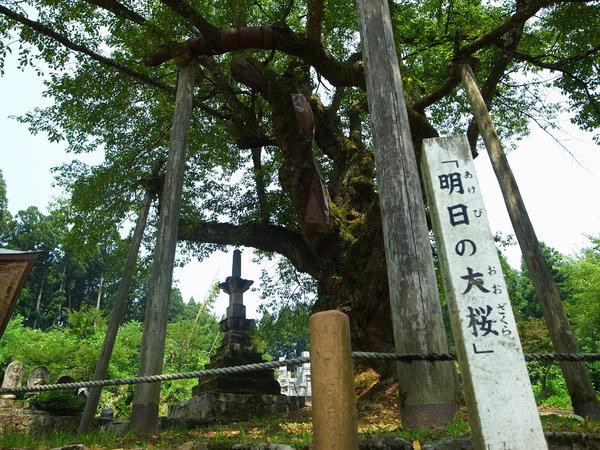 幹回り5m、樹の高さ13mの見事なエドヒガンザクラの老樹です。エドヒガンザクラは日本の山に自生する桜の一種ですが、老樹巨木になると多くが神社仏閣に保護されています。法福寺境内にあり、樹齢400余年の古木で巨木は県内でも珍しい樹であり、樹幹と枝張は見事でまだまだ勢いは衰えていません。また、「明日の大桜」として地元の人々にも親しまれており、毎年4月の第3日曜日には国の重要無形民俗文化財に指定されている「明日の稚児舞」が行われています。春の開花時期には多くの花見客の目を楽しませています。
