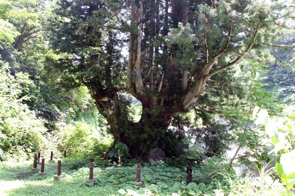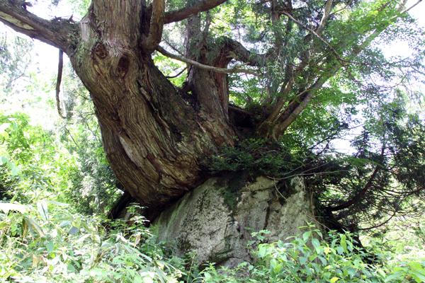 南又谷流域標高500~700m付近の推定樹齢500年以上の天然スギ群生地。古朴で幹に空洞があることから「洞杉」と呼ばれ、最大のもので幹周りが約16mあります。この地域のスギ群落の特徴は大きさや樹齢よりも、その立地と生育の携帯にあり、この地域の地形からは花崗岩質の巨大な転石が見られます。群落のスギの多くはこの巨大な石や露岩の上に乗るような形で生育しており、この大転石とそれを抱くスギの大木の根の様子は他では見られないような独特の景観を作り出しています。