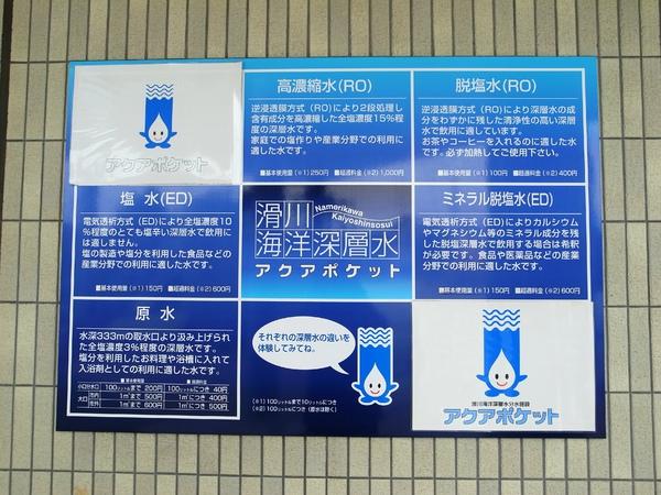 | 料金 | 【深層水】原水小口分水口100リットルまで220円、脱塩水10リットル102円、高濃縮水10リットル255円~ほか(全て税抜料金) ※塩水、ミネラル脱塩水の料金はお問い合わせください。 ※ペットボトル・ポリタンクの販売あり |