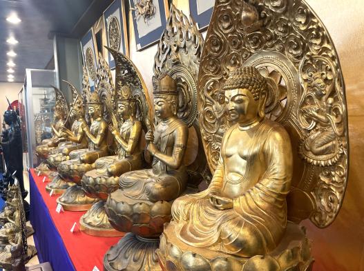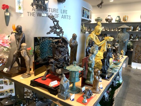 北陸随一の売り場面積を誇る展示場に高岡銅器をはじめ、錫、金銀製品、漆器、日本各地から世界の美術工芸品まで幅広く、豊富な作品をご覧いただけます。銅像の原型、製作工程・全国に設置された銅像(パネル展示)もご覧いただけます。祖師像・仏像・神馬・龍吐水・座牛のご購入や胸像・銅像の別注オーダー、修理・修復のご相談も承ります。人気の錫製品や高岡銅器のお土産・記念品も商品を見てお買い求めいただけます。