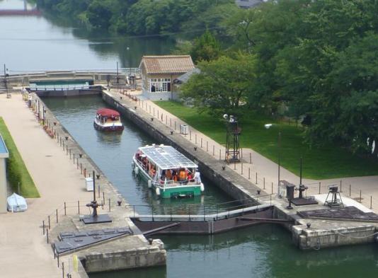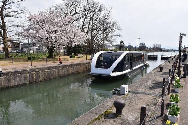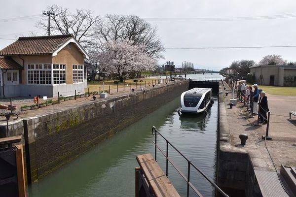 上流側(富岩運河環水公園)と下流側(岩瀬側)の水位差(国内最大級)を調節するパナマ運河方式の閘門。閘室内に船が入ると前後の門扉が閉じ、水位がどんどん変化する「水のエレベーター」を体験しながら通航できます。