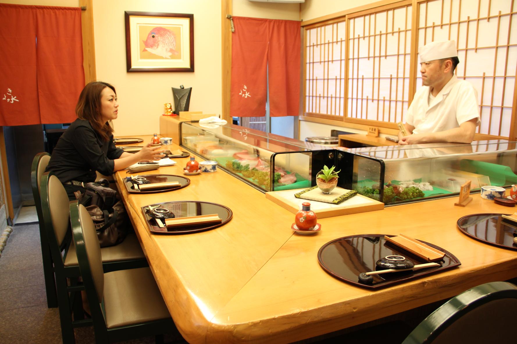 平成12年オープンの寿司処では、大将の父親が魚屋を営んでいたことから、毎朝市場で競り落とした旬ネタをお手頃価格で提供できるのが強みで、自家精米コシヒカリをシャリに用いるこだわりの一貫の自慢です。平日限定ランチだと1,100円から提供されているから、「気軽で美味しい」と好評で、女性客が8割を超える日もあるそう。抑えておきたい「もう一品」は、自家製のかに味噌ドレッシングを使った「かに味噌サラダ」です。マスターの手さばきと人柄を至近距離で感じるカウンター席の他、友人や家族との団欒や大人数宴会に最適な掘りごたつタイプの座敷スペースも用意されているので、あらゆる場面に重宝できます。