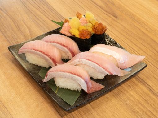 現在北信越各地で展開する回転寿司チェーン「きときと寿し」の1号店として、昭和63年にオープンした古参店です。チェーン店とは言え、現在素材調達の多くは各店の「最寄り」で行われており、「氷見本店」では氷見の市場で買い付けた旬ネタと、地元で獲れたブランド米「天高く」を井戸水で炊き上げたシャリを用いた氷見尽くしの一貫を届けています。香りと鮮度を引き立てる天然の「酢」と、香りと甘みを引き立てる専用ブレンドの金沢(大野)の「醤油」は、全店舗共通のこだわり。「本日の特だね!」や「店長のおすすめ!」、「本日の氷見産」などの個別皿や、選べる汁物とワンドリンクが付く平日限定ランチセットにはそれぞれのお得感が溢れています。タッチパネルを使う「最先端」と、職人へ直接声がけする「昔ながら」の両方を楽しめる注文方法で万人に愛される、本店ならではもてなしをご堪能あれ。
