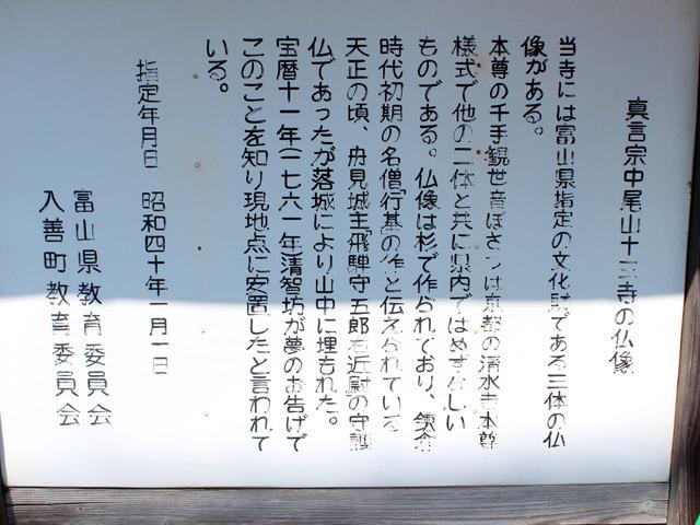 中尾山十三寺(なかおざんじゅうそんじ)は、「千手観音」「聖観音」「馬頭観音」の3体の菩薩像があり、県重要文化財の仏像を本尊とする真言宗のお寺です。