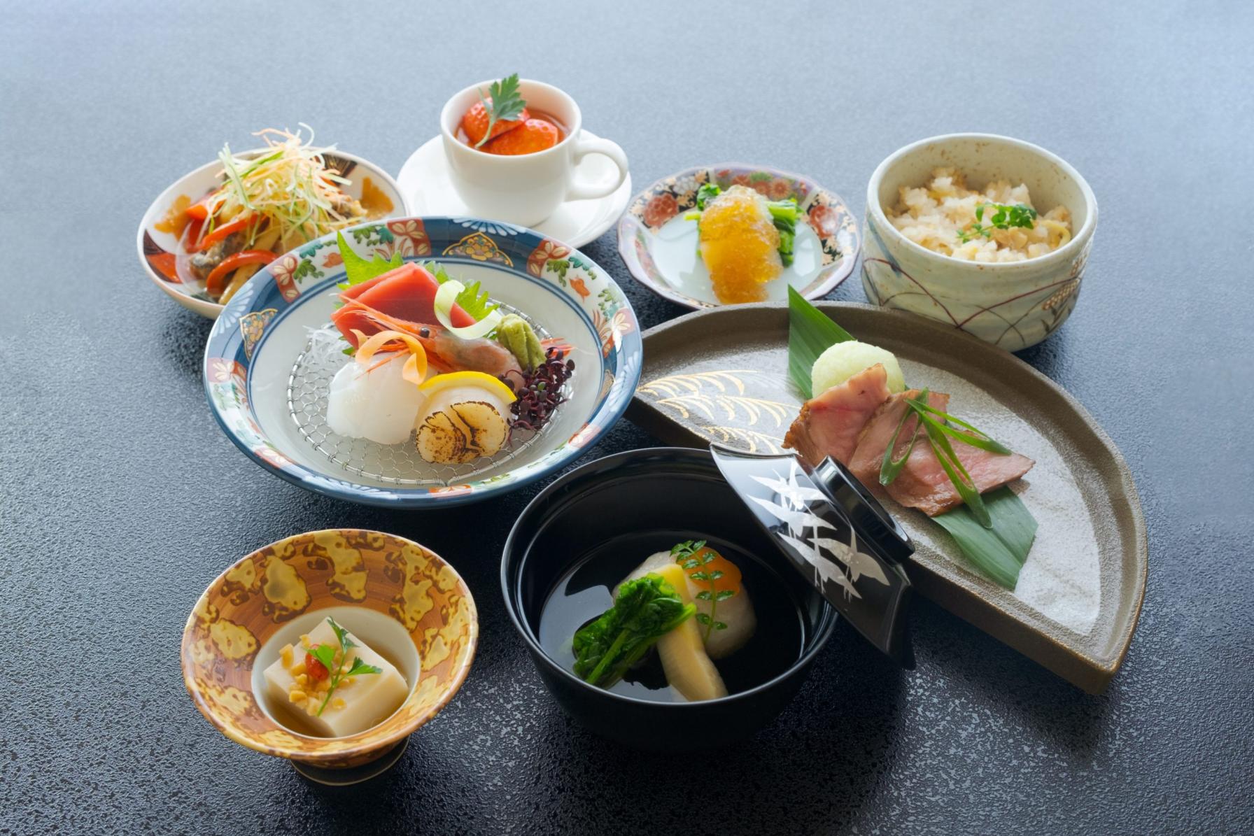 「水」「米」「酒」そして「天然の生簀」とも称される富山湾の「海の幸」といった豊かな自然が育む恵みと、正統派の和食の技巧を凝らした会席料理が堪能できる。