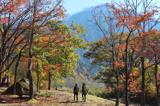剱岳の登山口馬場島エリアでは、ゆったりと散策する「家族の森散策コース」、自然の息吹を感じながら剱岳を仰ぐ「中山周遊コース」で紅葉を楽しめます。