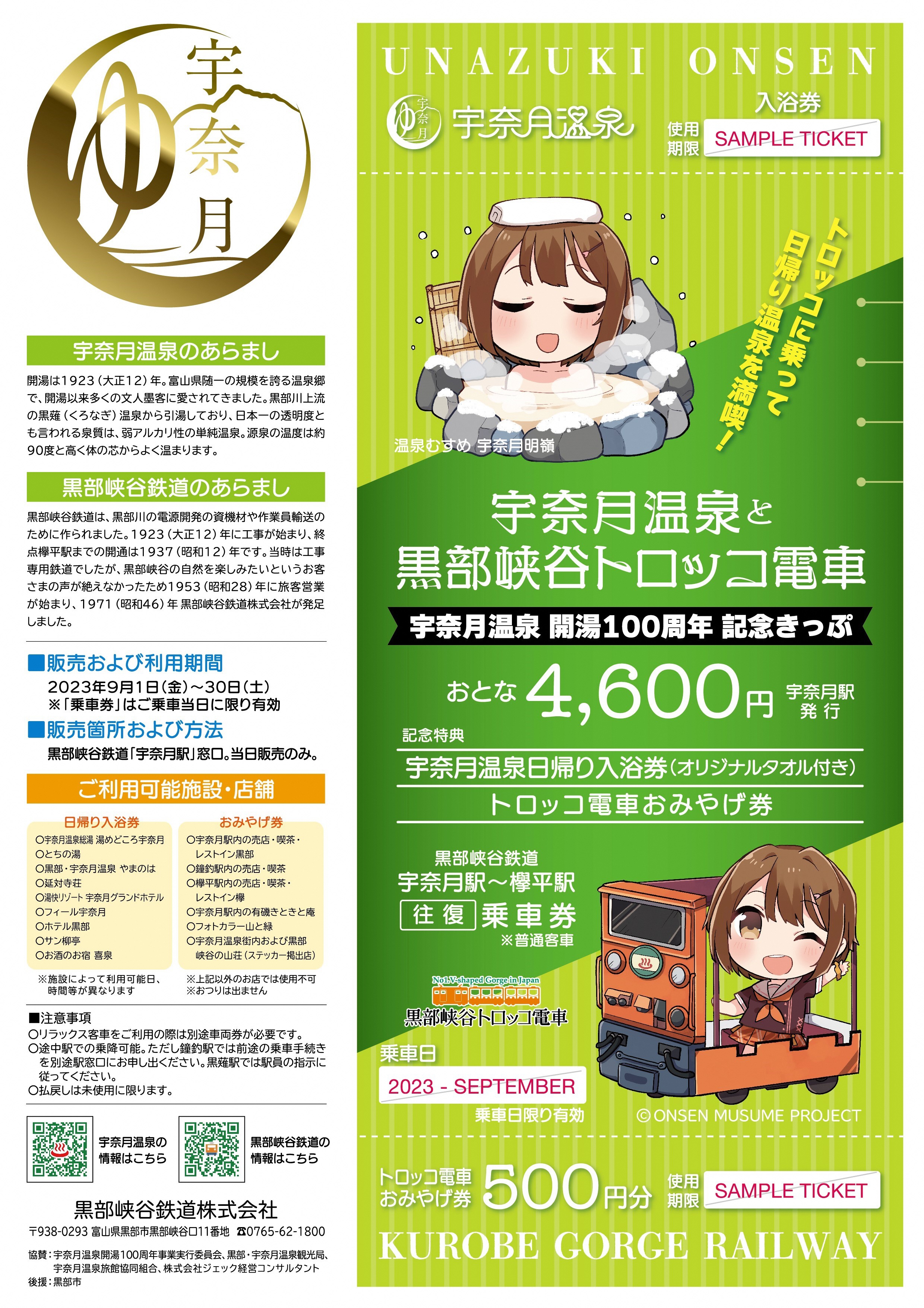 黒部峡谷鉄道では、宇奈月温泉開湯100周年を記念して、今年6月1日~30日に販売した「宇奈月温泉開湯100周年記念きっぷ」を好評につき再発売いたします!