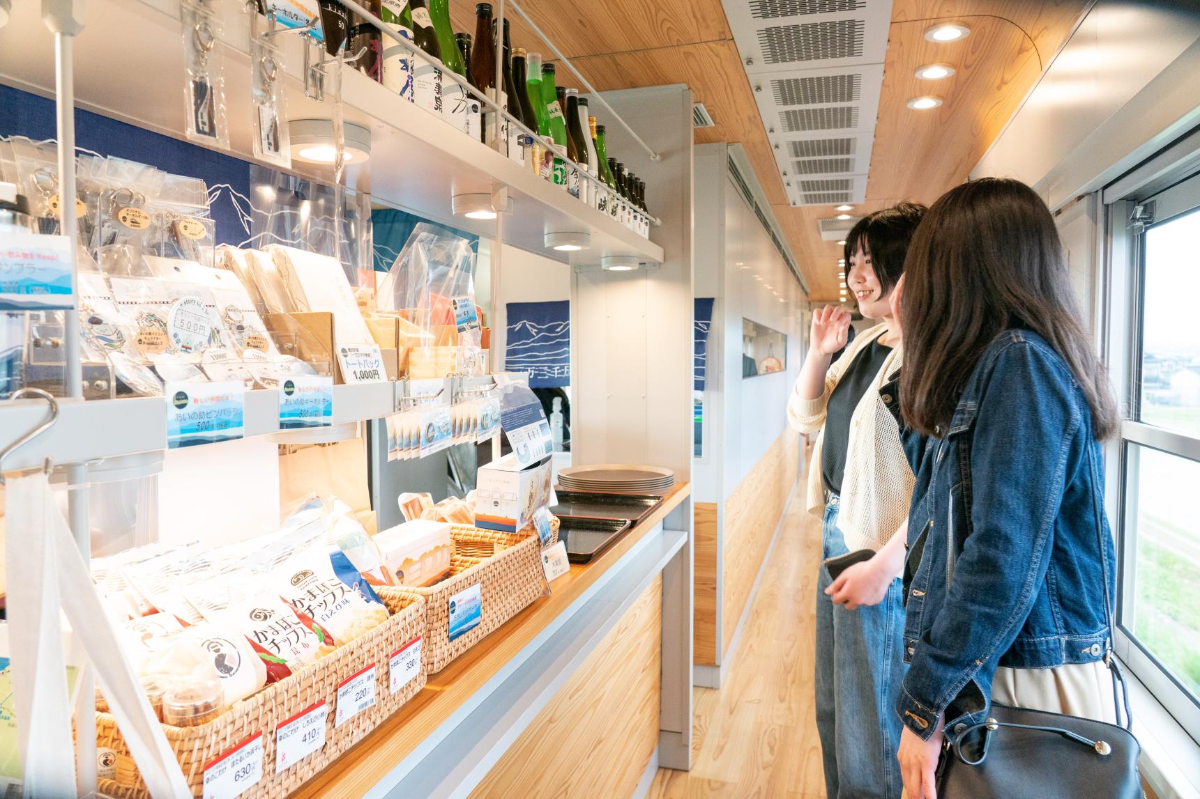 富山平野を横断する観光列車「一万三千尺物語」。山も海も、富山の魅力が存分に感じられる列車旅。富山の旬の素材を使ったお食事やお土産もご用意してお待ちしております。