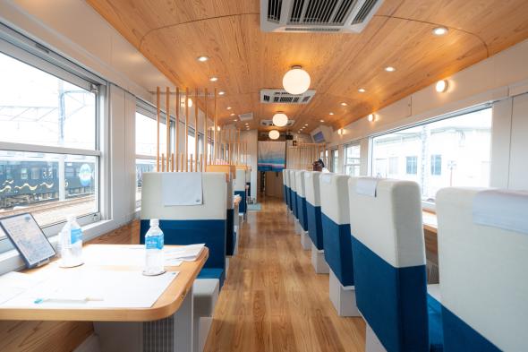 旧国鉄車両413系の歴史的情緒と、富山独特の自然的風雅を調和させたデザイン。歴史や自然のぬくもりを感じながら、ゆったりとお食事や、車窓からの風景を楽しんでいただけます。天井、床、テーブル等に富山県産の「ひみ里山杉」を使用し、「木」と調和した落ち着いた空間に富山湾を意識した「青」をアクセントとして使用しています。