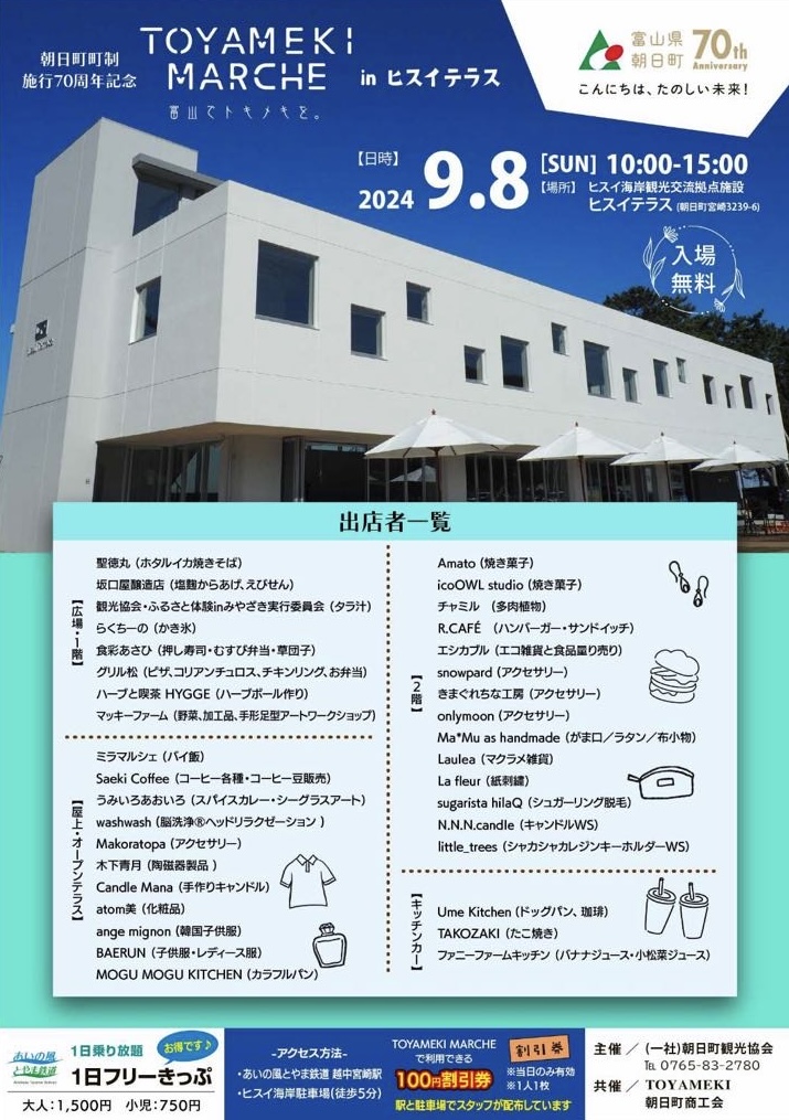 9/8(日)10:00~15:00『TOYAMEKI MARCHE in ヒスイテラス』を開催します。