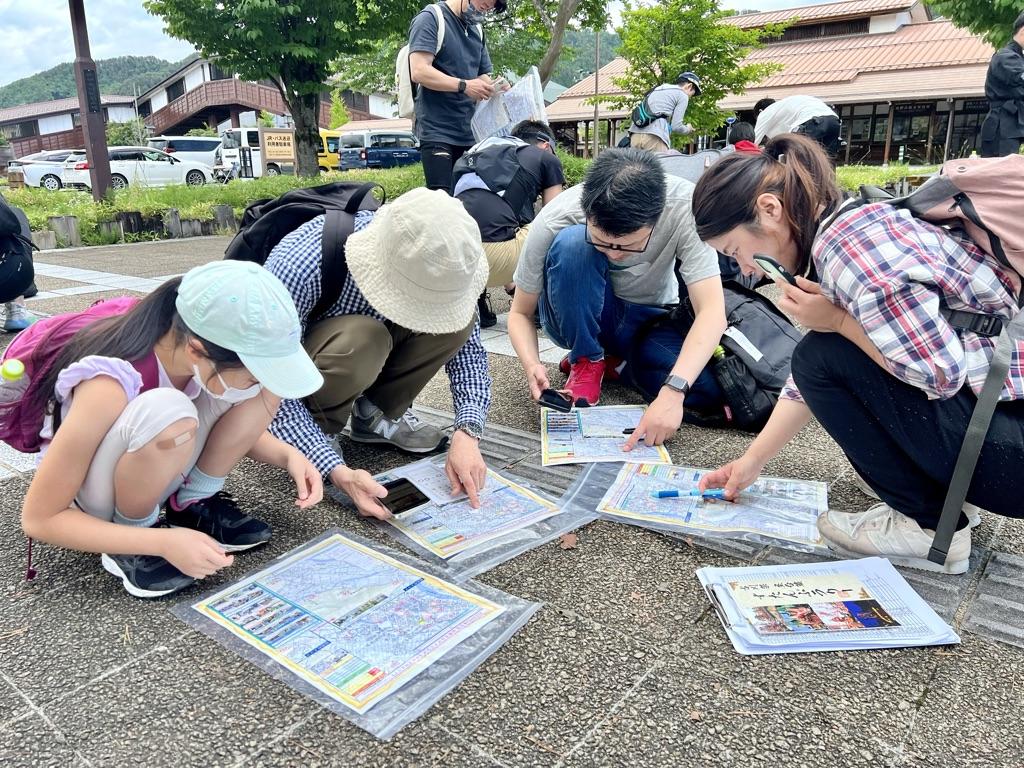 ①受付で配布する地図上のチェックポイントを見てチームでルートを考えます。