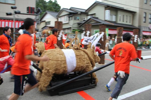 源平倶利伽羅合戦の際に木曾義仲が用いた作戦「火牛の計」にちなんだ、全国唯一の豪快で魅力あふれる祭りです。1999年から行われている火牛の計レースは、祭りの1番の見所で、鉄骨の台車の上に据え付けられた藁でできた巨大な牛を引いてタイムを競います。走る姿は誠に勇壮で、まるで840年前にタイムスリップしたかのような雰囲気の中、レースが行われます。 また、和太鼓や舞踊、まち流しのほか、キッズダンスなどのステージや屋台村コーナーなどイベント盛りだくさん!!小矢部市ならではの、楽しいお祭りとなっています。