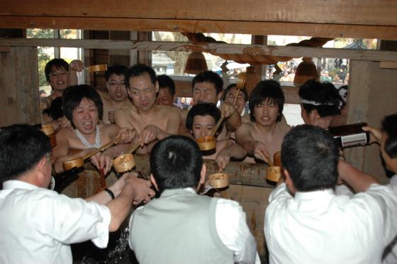 全国でも珍しい奇祭のひとつで、ふんどし一本の25歳の厄男たちが、先を争って神官のくみ出す神酒を柄杓で受け、参詣人や見物人に振る舞い、無病息災、五殻豊稽を祈願します。酒とり祭りの起源は一説によると、370年以上前に、下後亟が大凶作に襲われた際、村人が総出で酒をまいて無病息災と五穀豊穣を祈願したのが始まりとされていて、それ以降300年以上も続いています。境内は歓声と活気で満ちあふれ、男衆は酒を振る舞う回数が多いほど幸福に恵まれ、参拝客はより多く酒をかけられるほど幸が多いと言われています。 祭りを通して交流の輪が広がり地元住民が笑顔になれる素敵な祭りです。