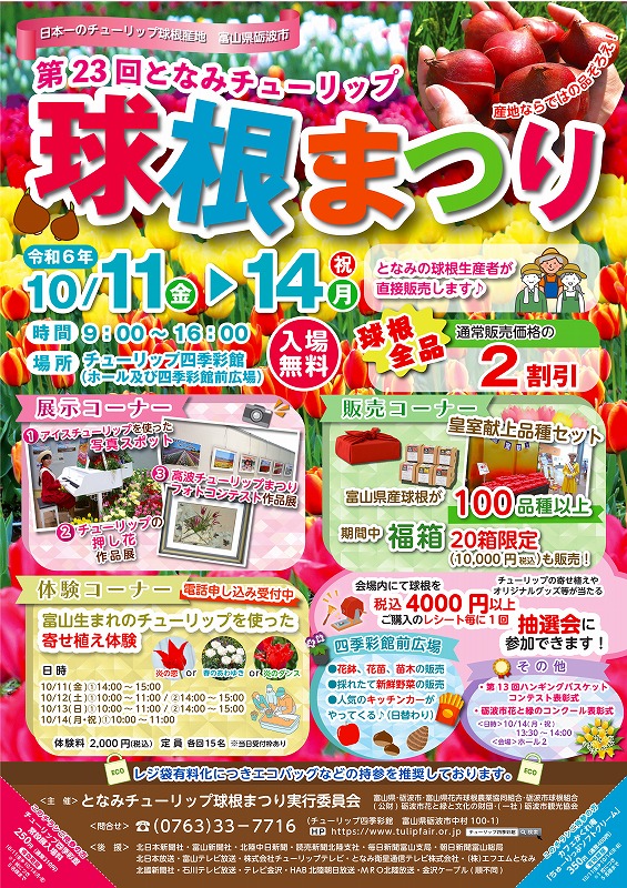 | 電話番号(備考) | 0763-33-7716(チューリップ四季彩館) |