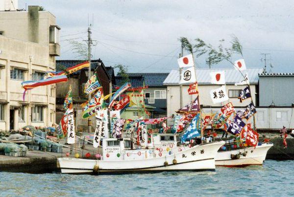 漁業者たちが大漁と海難無事故を海の神にお祈りするためのもので、屋形船や海上花火、灯篭流しが夜の海を染める豪快なお祭りです!生地における例祭は新治神社において行われますが、えびす祭りの場合は生地阿弥陀堂浜の「西の宮」で行われ、祭神も蛭児命(エビス)が祀られています。 夜には、神社に安置されているエビス、大黒の像を満艦飾にした漁船に乗せ、19:00ごろ黒部漁港から出航、生地沖を1時間程度巡航します。その後、生地小学校の子どもたちが家から持ち寄った灯篭流しが始まり、幻想的な雰囲気に包まれます。また、期間中「くろべ生地浜海上花火大会」も開催されます。約1,500発が打ち上げられる豪快な花火は必見です!