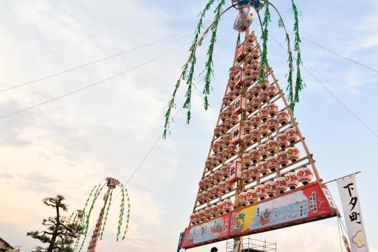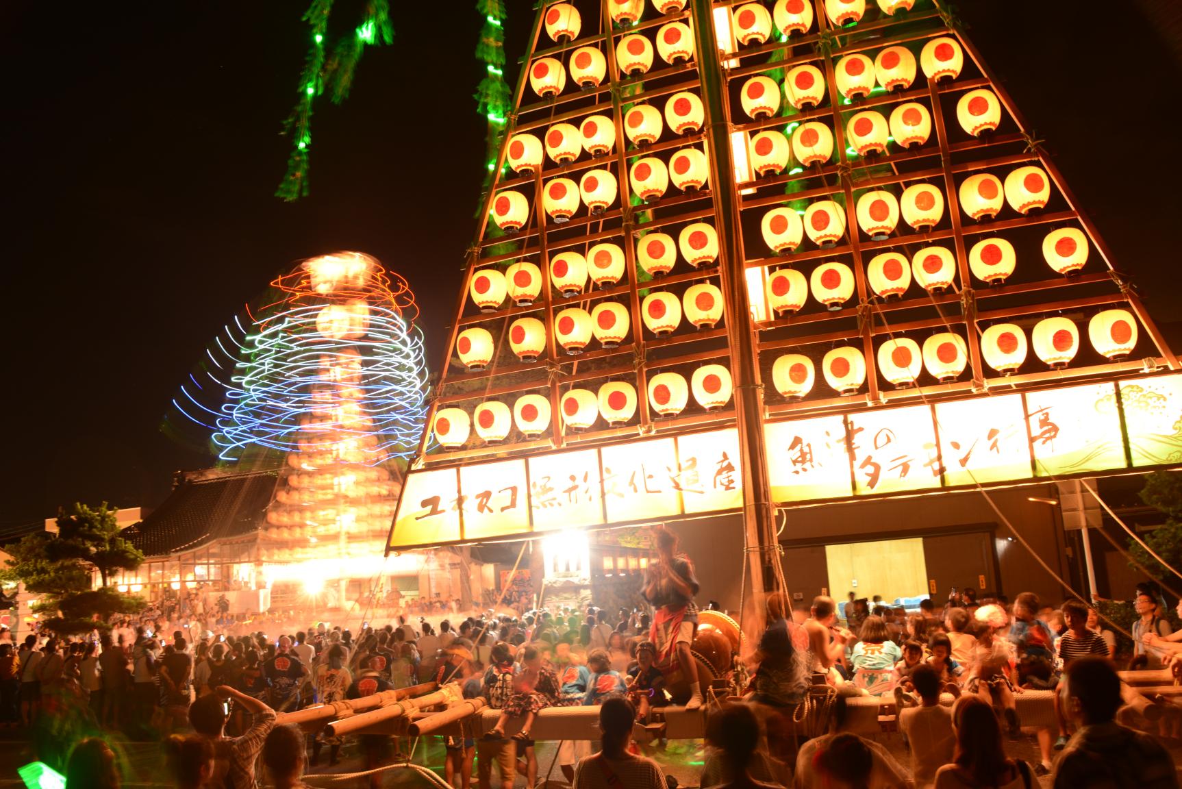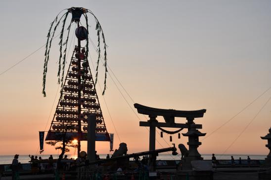 高さ約16mもある大柱に、90余りの堤灯を三角形につるし下げた「たてもん」と呼ばれる山車は、見るからに華麗で優美。そして、その総重量はなんと5トンにも。たいこや笛の囃子を鳴らし、はっぴ姿の人々の力によって、たてもんは魚津海岸沿いから諏訪神社境内へ曳き回されます。豪快な回転奉納は迫力満点! 豊漁と航海安全を祈願する伝統あるお祭りです。