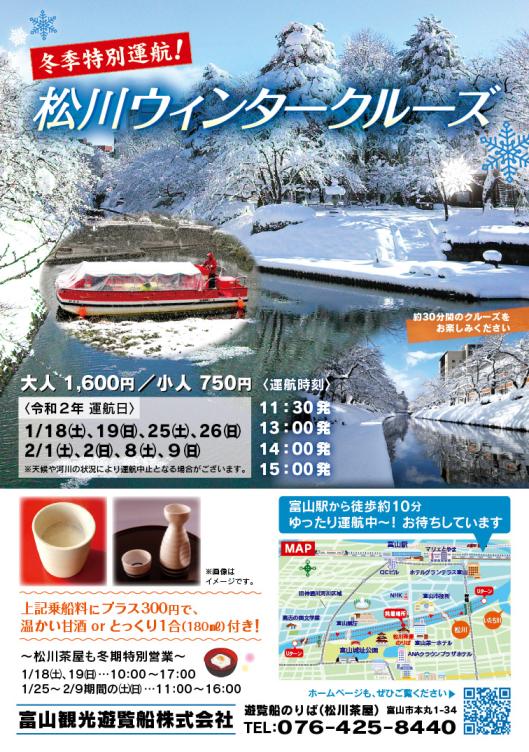 | 開催期間(テキスト) | 〈運航日〉 2020年1月18日(土)19日(日)25日(土)26日(日)2月1日(土)2日(日)8日(土)9日(日) 〈出航時刻〉 11:30発、13:00発、14:00発、15:00発※天候や河川の状況により運航中止となる場合がございます。 〈乗船時間〉 約30分 ※ご希望の日時の15分前までに松川遊覧船のりば(松川茶屋)にお越しください。 当日、運航状況が心配な場合は、直接、松川茶屋(TEL.076-431-5418)にお問い合わせください。 |