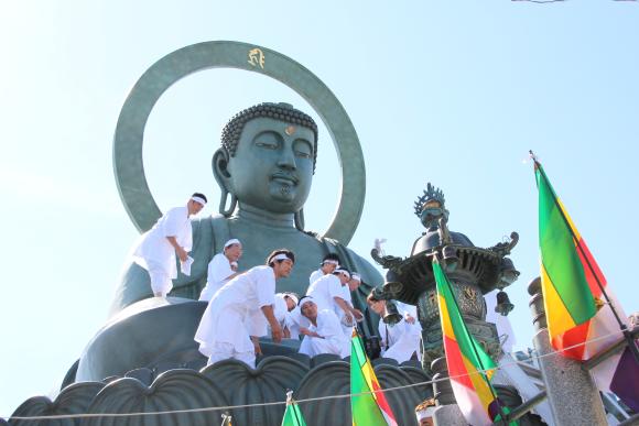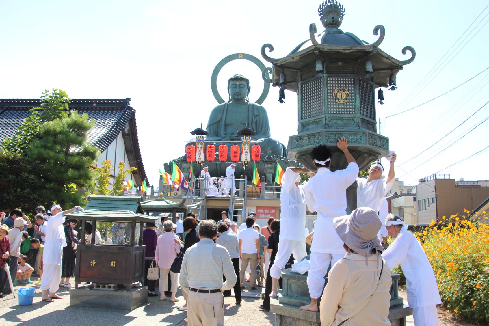 1年に一度、白装束に身を包んで大仏さまを拭き清める「お身拭い」のほか、交通安全祈願、提灯飾り等が行われます。