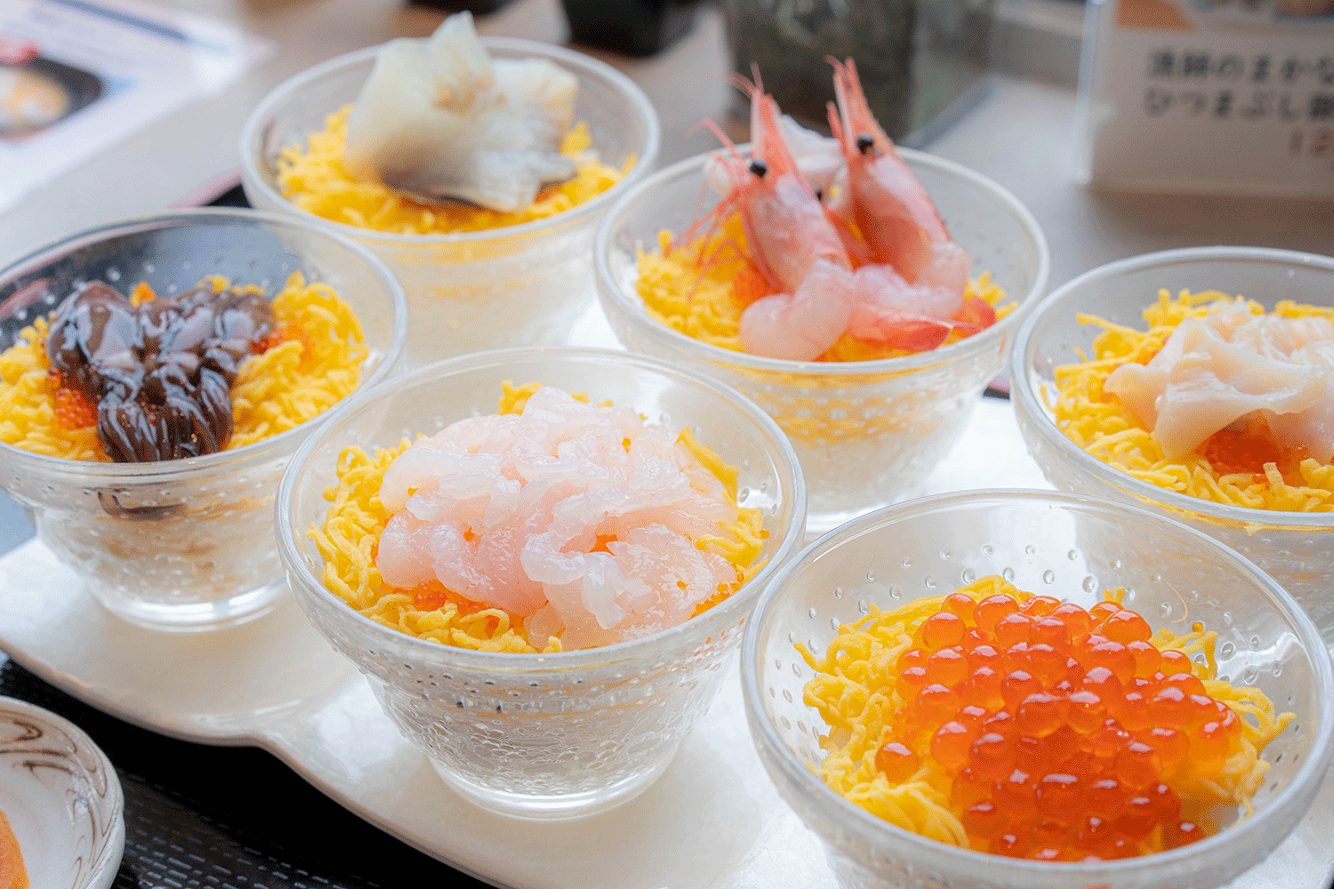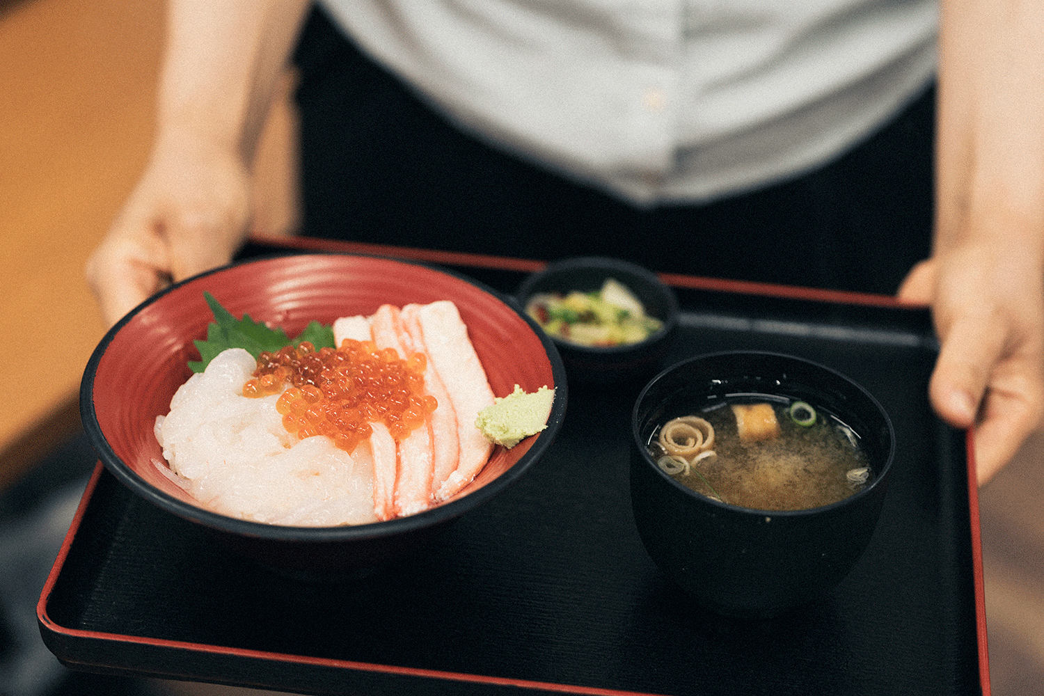「地元で獲れる魚を地域の人に楽しんでほしい」という想いから、水橋漁港横に2021年に誕生した地元漁師らによる海鮮食堂。漁師と料理人で考案しているメニューは、味はもちろん見た目も華やか。中でも、カニやシロエビなど10種類から好きな小丼ぶりを組み合わせられる「水橋選べる小丼ぶり 6種」(2,200円)が女性に人気。冬期はブリの小丼ぶりもおすすめ。