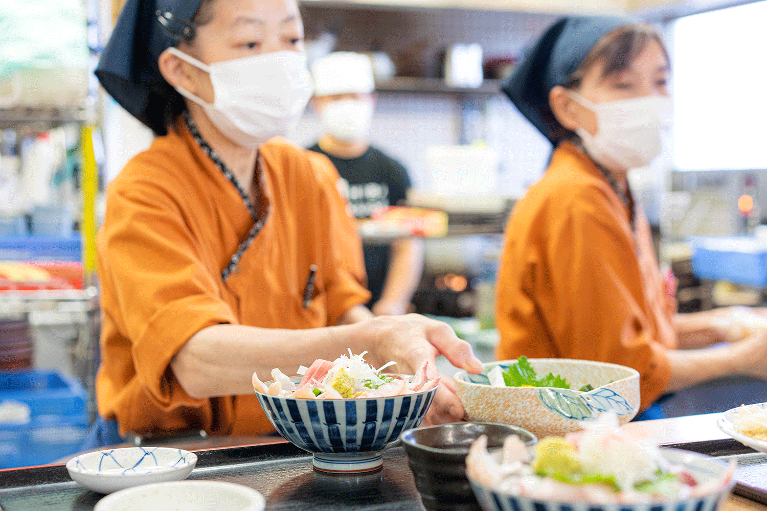 漁港の活気ある雰囲気を体験したい人におすすめなのが、朝早い漁港に合わせて早朝から営業している「きときと食堂」と「氷見魚市場食堂」。氷見魚市場食堂では、お店の目の前で行われる朝競りも見学できます。