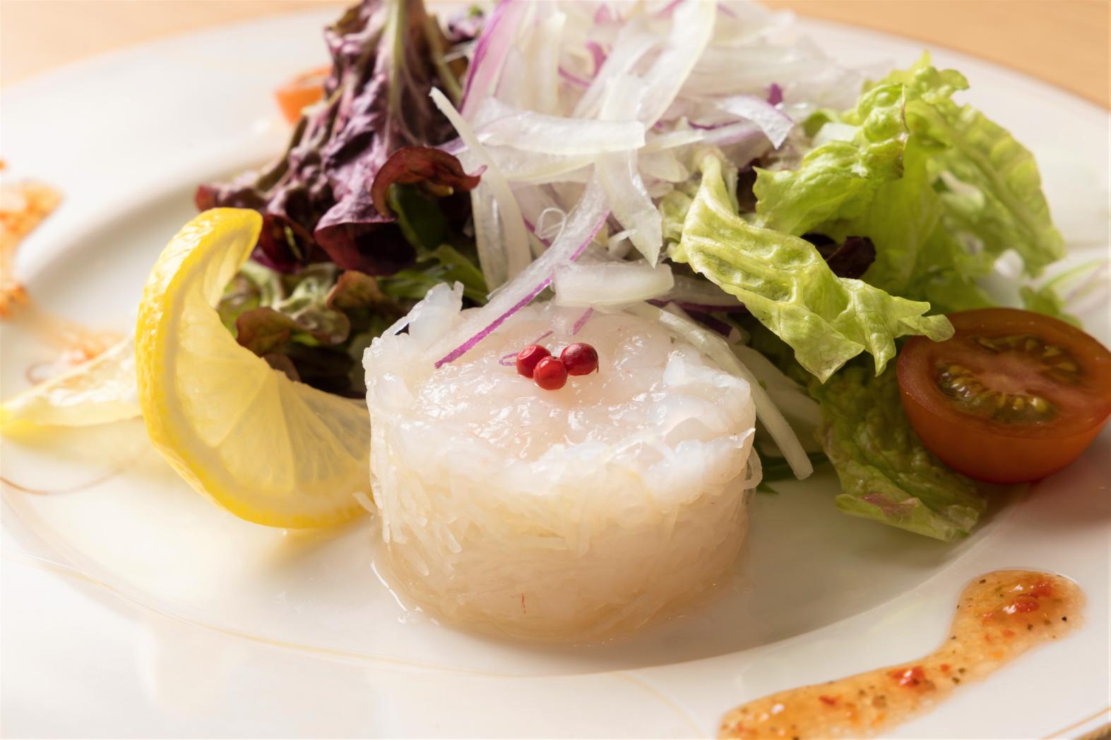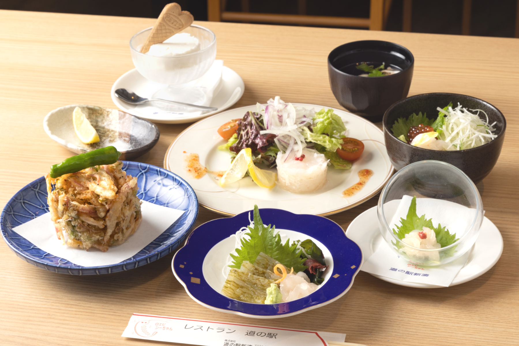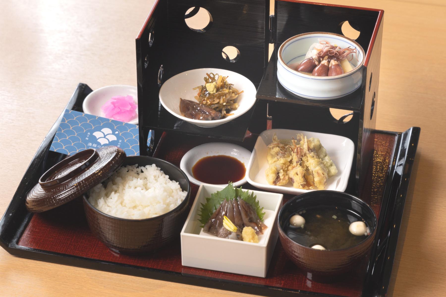 3月から5月まで楽しめる「蛍烏賊御膳」には刺身、天ぷら、酢の物、素干し、沖漬けなど、新鮮かつ大ぶりのホタルイカがたっぷり!滑川産こしひかりのごはんがもりもり進む、旬味豊かな至福のメニューを、富山湾の眺めとともに楽しんで。