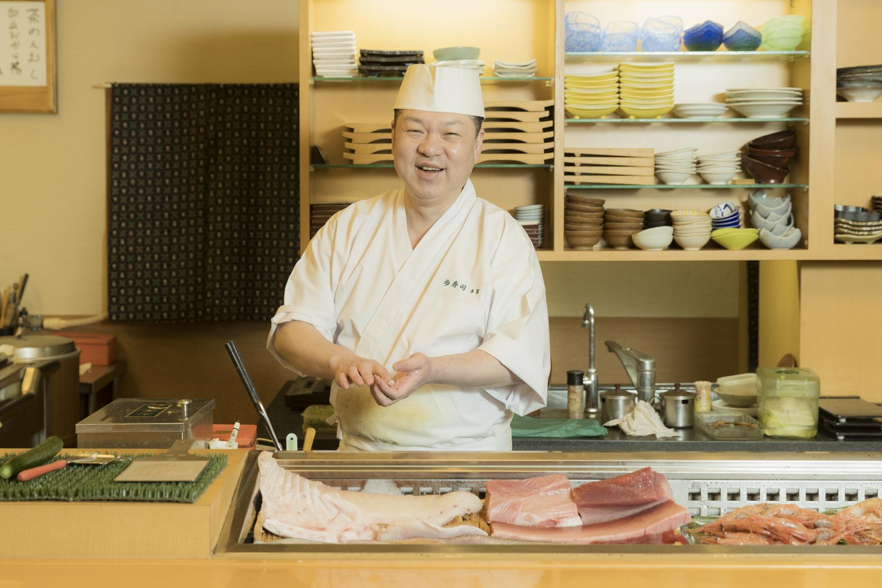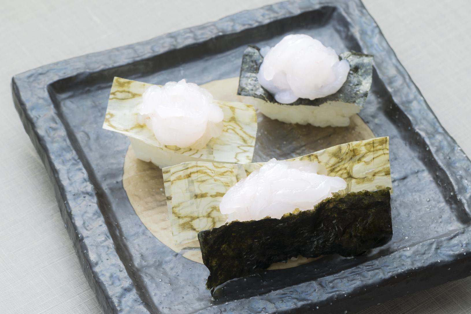 『歩寿司 本家』では、富山ならではのシロエビのお寿司を、注文の度に違った食べ方で提供し、お客様を楽しませています。握りの注文を受けて最初に提供するのは、薄い白昆布でシャリを巻いて刺し身のシロエビを盛り付けたもの。口に運ぶと、甘くとろけるシロエビの余韻に心が奪われます。穏やかな旨味を持つ白昆布で巻いているのが、昆布の消費量が日本でトップクラスの富山らしさを感じされます。