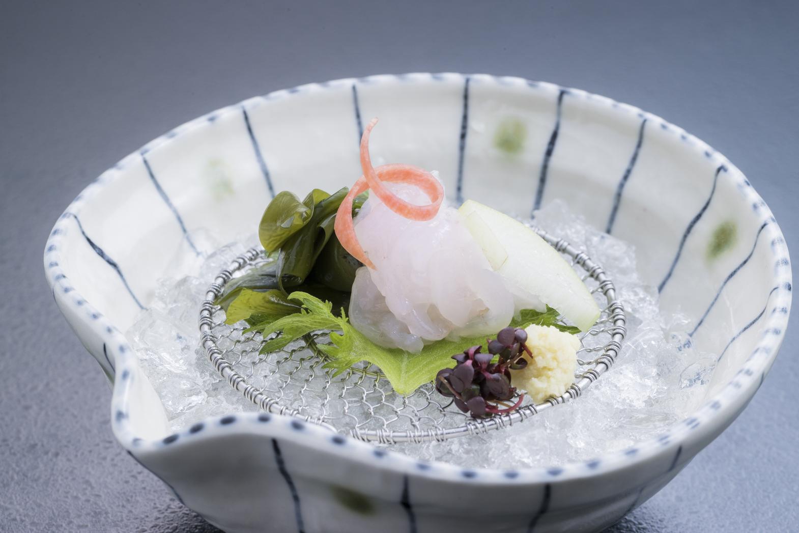 『割烹かわぐち』は、新湊漁港の競りに参加できる権利を持ち、朝と昼の競りで料理人が目利きした魚介を直に仕入れています。港から直接買い付けるので、鮮度の高さはピカイチ。注文を受けてから、店内の生簀の魚を直接捌いて提供している料理もあります。