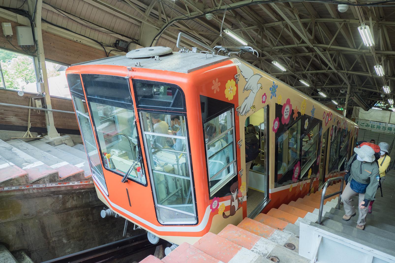 立山駅から美女平までの1.3㎞を7分かけて運行しています。標高差が500m、平均勾配が24度の坂道を一気に登り、窓からは溶岩が固まった柱状節理(材木石)も見られます
